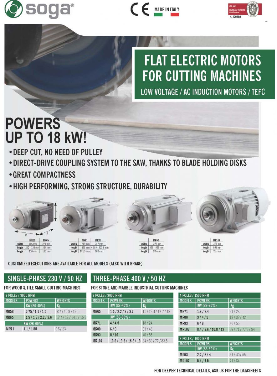 意大利Soga石材切割機MR系列,一款臥式,三相/單相低壓交流感應(yīng)切割電機,轉(zhuǎn)速有3000轉(zhuǎn),1500轉(zhuǎn),1000轉(zhuǎn)。MR58/MR65/MR71/MR80/MR93系列防護等級IP55,MR107系列防護等級IP65。切割電機功率高達18KW,切割能力強,不需要滑輪帶動,直接驅(qū)動耦合系統(tǒng)的鋸,因刀片的持有磁盤。密實度強,性能良好,結(jié)構(gòu)堅固耐用。MR58/MR65/MR71用于木材和瓷磚的小型切割設(shè)備,MR80/MR93/MR107用于石材和大理石工業(yè)的切割機。